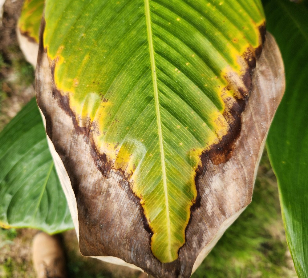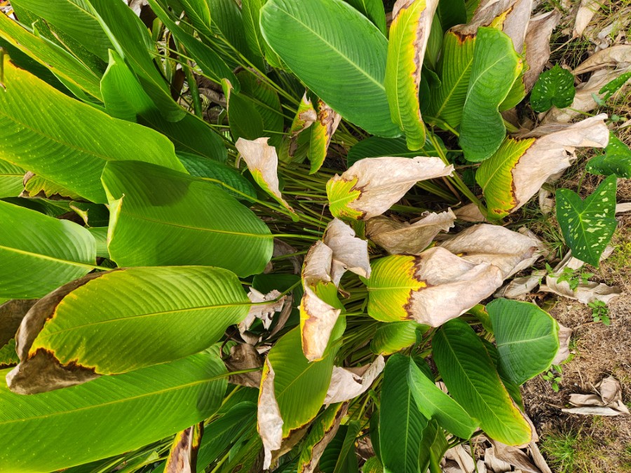 In one area of my farm, I've been having some problems with all of my zingiberales. I've not been able to identify what the problem is, so I'm hoping you guys can help me. Nothing has ever been particularly happy in this spot, but I didn't notice these leaf problems until about a year ago.